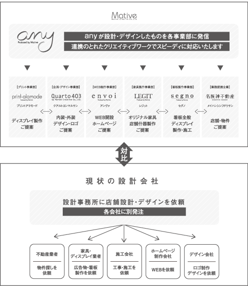 - SOHOやオーナーショップ、フランチャイズ展開ほか、ご希望に沿った最適な空間づくりを企画・ご提案いたします。【any】では店舗のコンセプトづくりから設計・デザイン、施工まで、時間もコストも一切ロスのない一貫体制を確立。スピード感を持って、イメージを実際のカタチへと変えていきます。また、「空間が完成するまで」ではなく、その後のプロモーション等、ビジネスがスムーズに軌道に乗るまで責任を持ってサポート。コンサルティングもぜひお任せください。