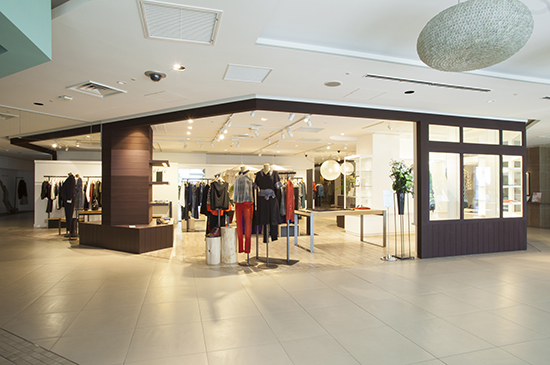 「cotelac」様のブランドイメージであるフレンチモダンを意識した内装にアイデンティティーである「天然素材」 ~無垢の木材+黒皮鉄の什器、モルタルの床など素材の表情を重要視した内装デザインを目指しました。